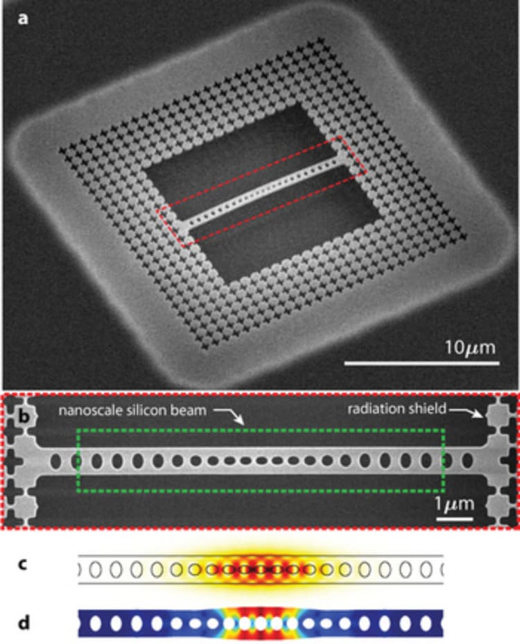 ![A scanning electron microscope image (a) of the nanoscale silicon mechanical resonator used in the laser cooling experiment. The outer “cross” patterning forms the shield while the central beam region, the SEM image of which is shown in (b), forms an optical cavity where laser light is used to cool the mechanical motion of the beam. Numerical simulations of the localized optical field and mechanical breathing motion of the nanobeam are shown in panels (c) and (d), respectively.[Credit: Caltech/Painter, et al.]](/uploads/images/image/nanoscience/1970-CT_OPainter_SPOTLIGHT_medium.jpg)