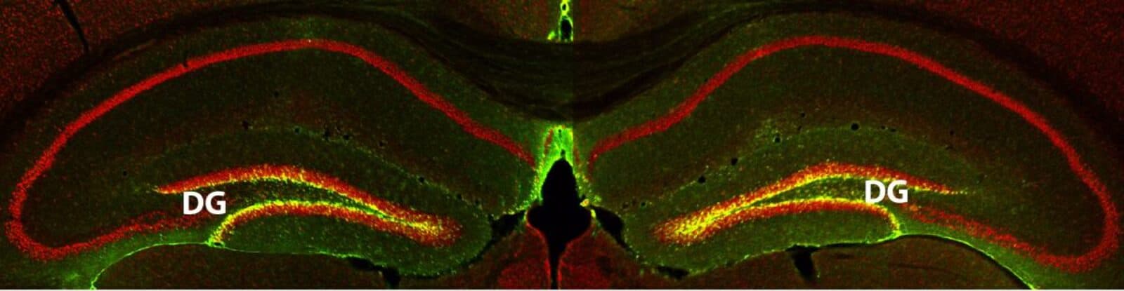 The researchers have identified a protein—RbAp48—that, when increased in aged wild-type mice, improves memory back to that of young wild-type mice. In the image, yellow shows the increased RbAp48 in the dentate gyrus. Image credit: Elias Pavlopoulos, PhD/Columbia University Medical Center