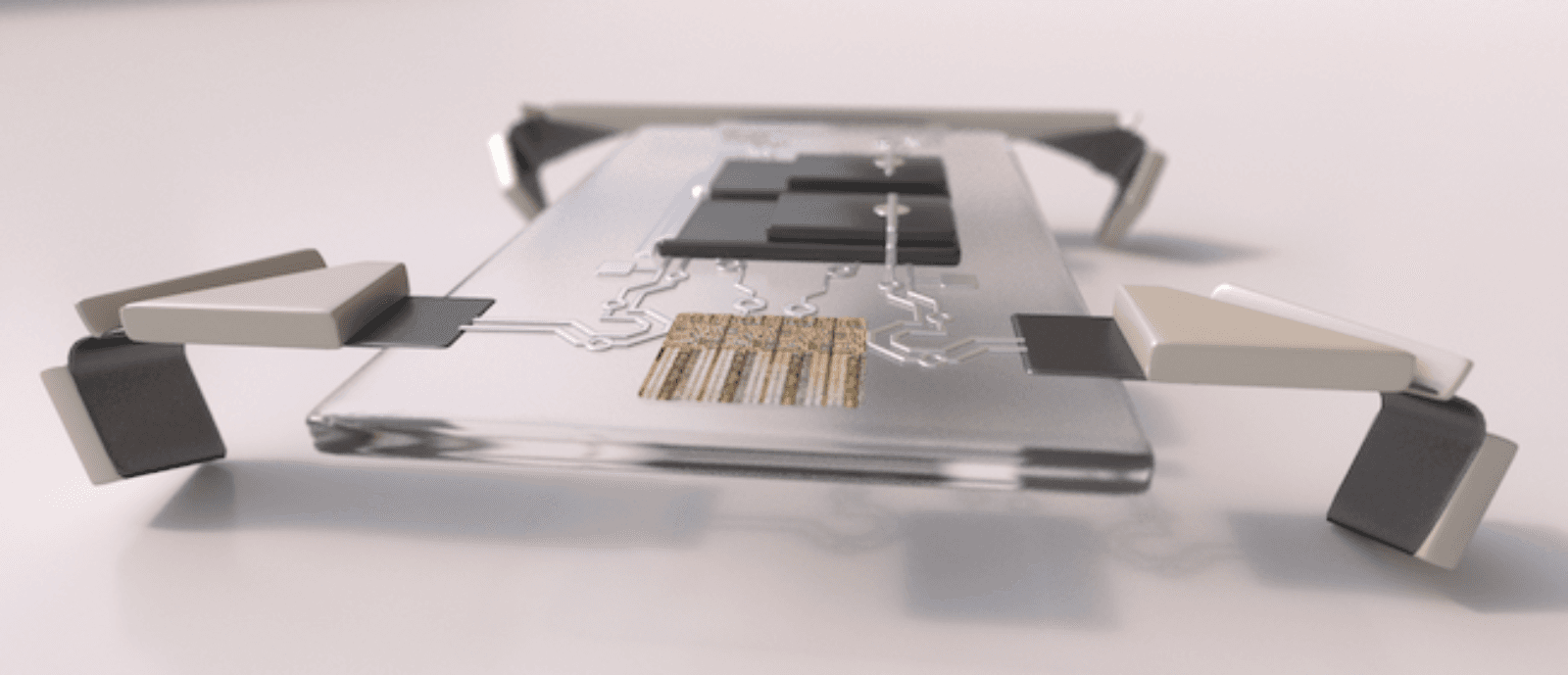 They started with a silicon body and four folded legs made of thin platinum strips coated on one side with titanium. As a solar cell charged up the platinum, it attracted ions floating nearby. These absorbed onto the platinum surface and caused it to contract while the titanium layer remained unaffected. This pulled the titanium around the platinum, bending it like a knee.