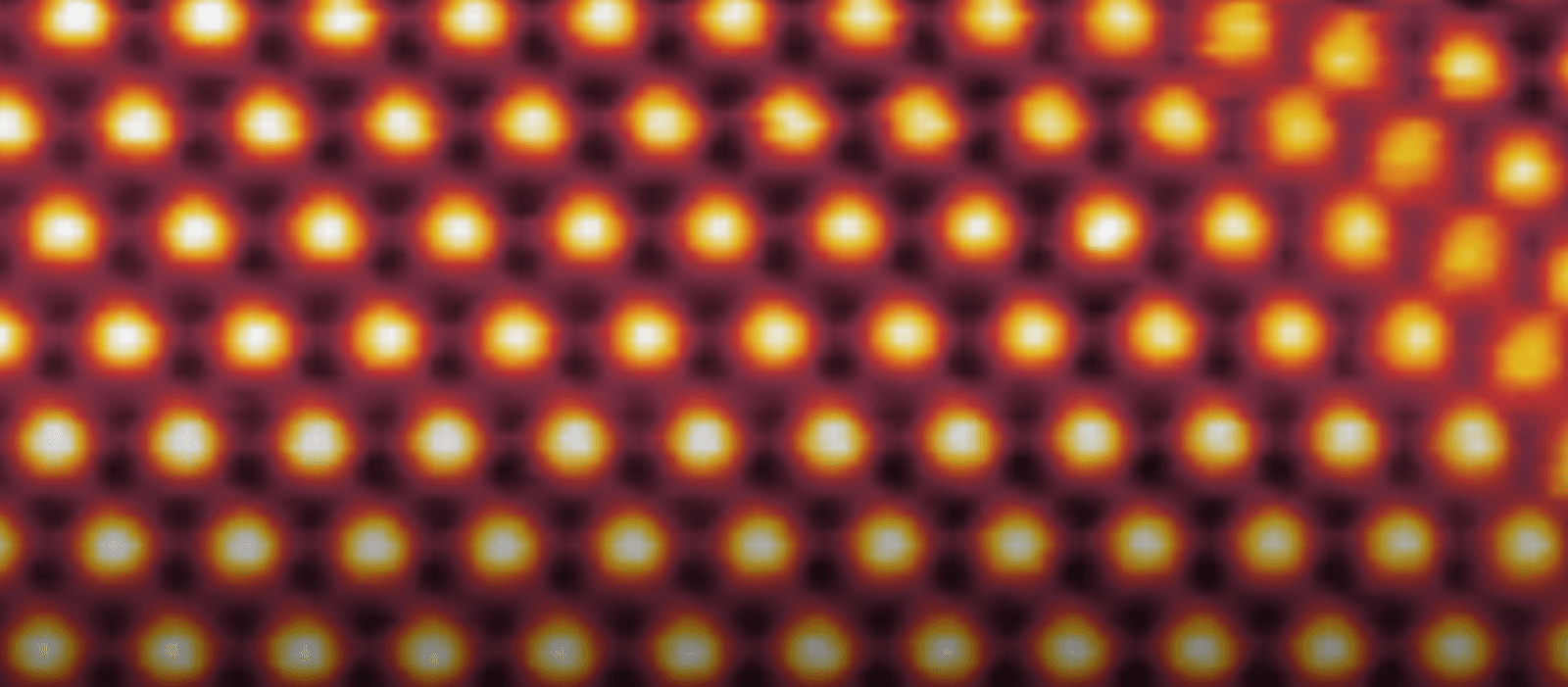 The surface of a trilayer of graphene, as imaged by a scanning tunneling microscope. Due to the twist of a second layer, trilayer height is modulated with a period of about 9 nanometers.